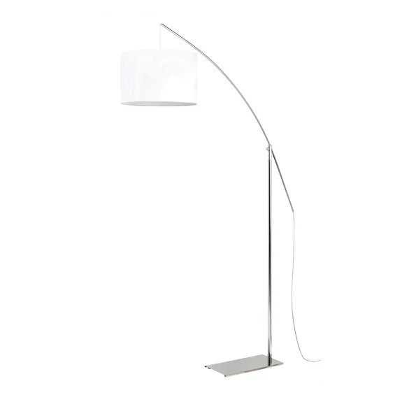 Elegantní oblouková stojací lampa Rainbow v chromovém provedení Velká, půvabná oblouková stojací lampa Rainbow přesvědčí štíhlými liniemi a sofistikovanou kombinací materiálů a barev. Plochá, hranatá základna se snadno vejde pod nábytek a díky svému rozlehlému tvaru umožňuje svítidlu optimálně osvětlit požadované oblasti, aniž by zabíralo mnoho místa. Pohodlným prvkem je možnost nastavení výšky, kterou umožňuje horní pohyblivé rameno. Zatímco chromovaný rám je vyroben z kovu, válcovité velké stínidlo z látky je zcela bílé. Charakter stínidla zajišťuje rozptýlené světlo, které se rozprostírá po celé místnosti. Díky otevírání směrem dolů dopadá světlo přímo na vybranou plochu a představuje se jako praktický společník v čtecím koutku. Rainbow lze pohodlně ovládat pomocí integrovaného nožního spínače