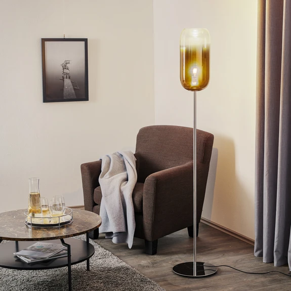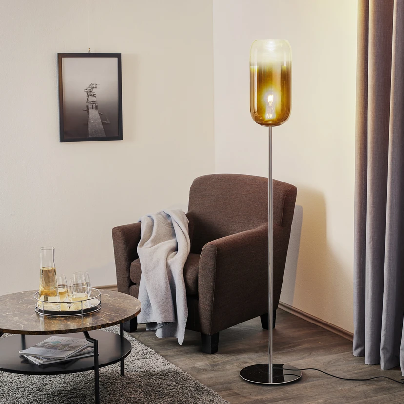Designová stojací lampa Gople s dekorativním stínidlem z barevného průhledného skla Stojací lampa Gople je světelný objekt se štíhlým rámem, jehož jednoduchost ponechává prostor pro mimořádně esteticky navržené skleněné stínidlo, které je ručně vyrobeno starou benátskou technikou v kombinaci s inovativní povrchovou úpravou.