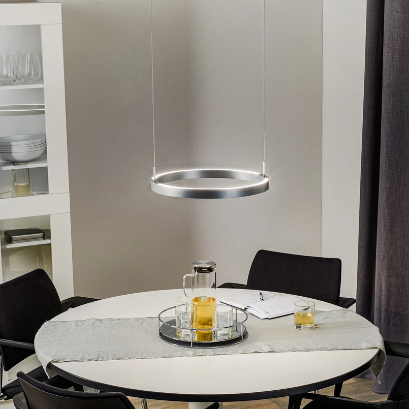 Závěsné svítidlo Float LED, výškově nastavitelné a ovládané gesty Kulaté závěsné svítidlo Float LED ve tvaru kruhu z hliníku poskytuje světlo směrem nahoru i dolů a nabízí maximální možnou flexibilitu. Díky zvedacímu systému lze zavěšení svítidla plynule nastavit v několika jednoduchých krocích a je vybaveno ovládáním gesty, které lze použít nejen ke změně barvy světla, ale také k jeho ztlumení. Světlo svítící nahoru a dolů lze přepínat zvlášť, nastavovat barvu světla a stmívat ho. Spektrum barevné teploty sahá od teplého bílého světla s teplotou 2 000 K až po univerzální bílé osvětlení s teplotou 5 000 K. S barvou světla se mění i světelný výkon a index podání barev - 4 000 lumenů v teplé bílé barvě světla (2 000 K) s indexem podání barev Ra 80 - 5 000 lumenů v univerzální bílé barvě světla (5 000 K) s indexem podání barev Ra 90 Float je vysoce kvalitní závěsné svítidlo pro domácnost od společnosti Bopp-Leuchten. Společnost, která existuje již od roku 1912, sídlí v Limbachu v Odenwaldu a nyní ji vede již třetí generace rodiny. Společnost se věnuje výrobě vysoce kvalitních svítidel do obývacího pokoje, která splňují nejvyšší standardy kvality. Při výrobě svítidel je ve vysoké míře zohledňována ochrana životního prostředí a udržitelnost, například prostřednictvím regionálních dodavatelů, aby byly zachovány krátké vzdálenosti.