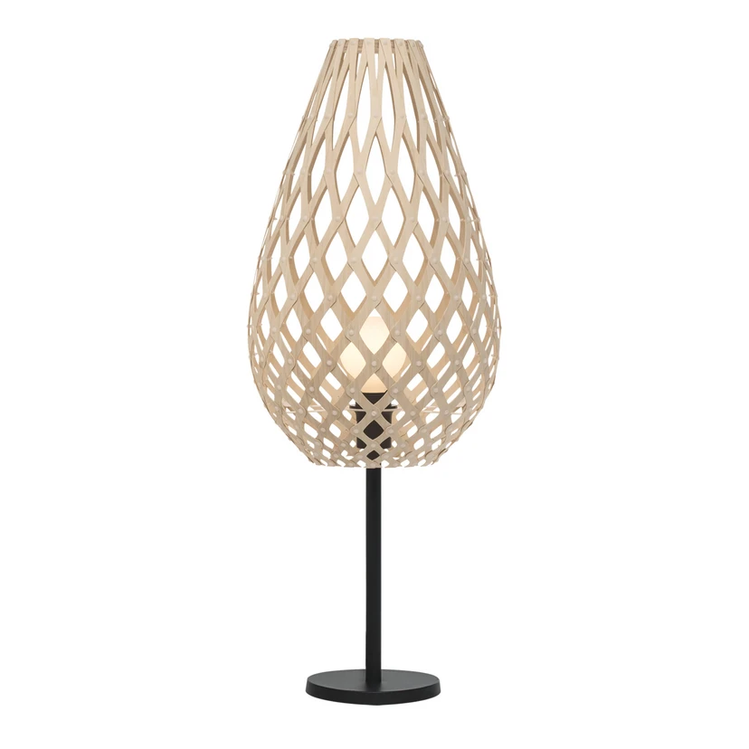 Stojací lampa Koura s proutěným stínidlem z bambusu - Design by David Trubridge Stojací lampa Koura má stínidlo ve tvaru kapky ve tvaru koše a stojí na štíhlém hliníkovém podstavci. Stínidlo se skládá z mnoha jednotlivých částí vyrobených z bambusové dýhy a připomíná pletený koš. Světlo žárovky prosvítá různě velkými prohlubněmi a vytváří v okolí okouzlující stínový vzor. Ať už v ložnici na nočním stolku, nebo v obývacím pokoji na podlaze, na stoličce či na stole - Koura šíří své přírodou inspirované kouzlo všude, ať už osvětlená, nebo neosvětlená. Tvůrce svítidla Koura, designér David Trubridge, který pochází z Anglie a nyní žije na Novém Zélandu, klade při výběru a zpracování materiálu velký důraz na udržitelnost a ochranu životního prostředí. Použitá bambusová překližka pochází z udržitelného pěstování dřeva. Hotová lampa se dodává složená naplocho a po obdržení je třeba ji sestavit. Přesný návod k montáži je součástí balení.