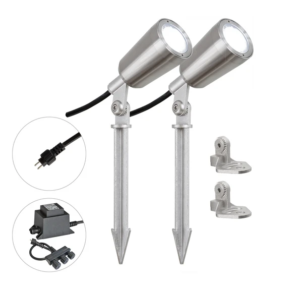 sada 2 kusů s transformátorem a rozdělovačem: LED zahradní reflektor PC6806 z nerezové oceli se zásuvným systémem IP44, otočnýV této sadě najdete LED reflektor PC6806 dvakrát. Každý bod má 5 m dlouhý připojovací kabel pro zásuvný systém s krytím IP44 a je dodáván s uzemňovacím hrotem a montážní základnou. Díky tomu lze body montovat různými způsoby, buď přímo do země, nebo na kamennou desku. Kromě toho jsou tato místa chráněna proti trvalému ponoření do hloubky až 1,5 metru. Lze je otáčet až o 60° a vysoce kvalitní LED moduly se instalují ze závodu. Součástí této sady je také třícestný rozdělovač a odpovídající předřadník s krytím IP44 s obrysovou zástrčkou, takže spoty lze uvést přímo do provozu.Technické vlastnosti/charakteristiky- praktická sada 2 ks včetně transformátoru a třícestného rozdělovače- s uzemňovacími hroty a montážními nožičkami- otočné- rozložení světla: symetrické- středně široké rozložení: 21° až 40°- třída ochrany spotů: IP68 (chráněno proti ponoření do hloubky 1,5 m)- Napěťové body: 12 V (AC/DC)- Body s 5 m dlouhými připojovacími kabely pro zásuvný systém IP44