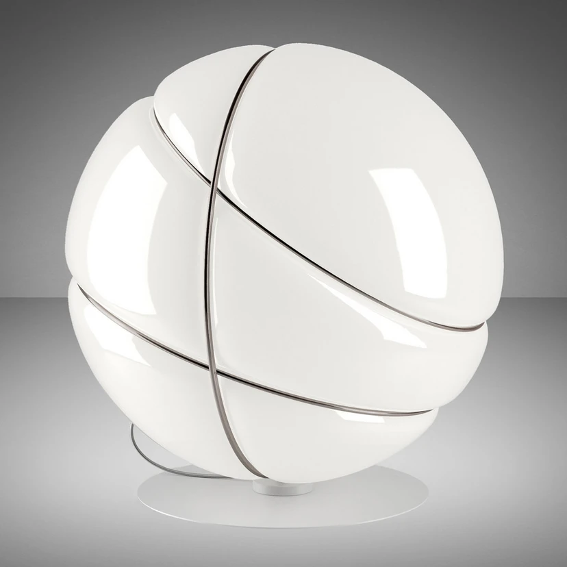 Stolní lampa Armilla vyřezává vynikající postavu jako dekorativní světelný akcent pro soukromé a veřejné salonky. Kulatý odstín je umístěn na diskrétním kulatém podstavci, kterému designér Lorenzo Truant jako speciální prvek dal tři úzké prsteny z leštěného kovu, jejichž lesk úžasně harmonizuje s hladkým povrchem bílého skla.