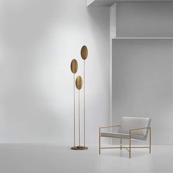 Stmívatelná stojací lampa Masai LED se třemi oválnými listyStojací lampa Masai LED v teplém kartáčovaném bronzovém provedení je ideální pro nepřímé osvětlení. Svítidla této řady, která pro italského výrobce ICONE navrhl Marco Pagnoncelli, se vyznačují oválným tvarem. Ten se u stojací lampy projevuje třemi hliníkovými prvky, které jsou na jedné straně osazeny teplými bílými LED diodami a jsou podepřeny různě dlouhými rameny. Základnu tvoří kulatý podstavec - dobré podání barev: CRI 90 - vybavený stmívačem na zásuvném kabelu