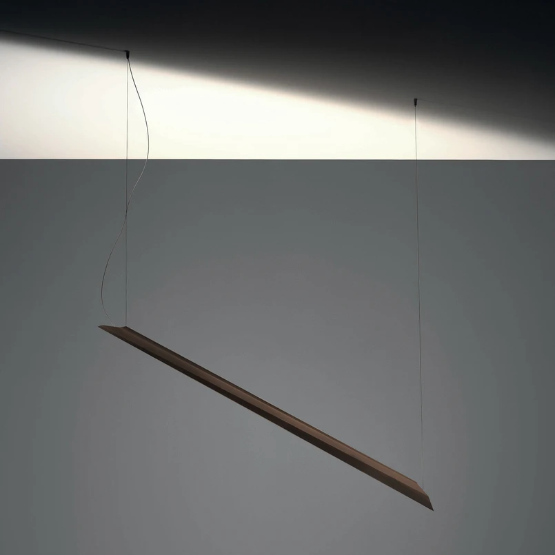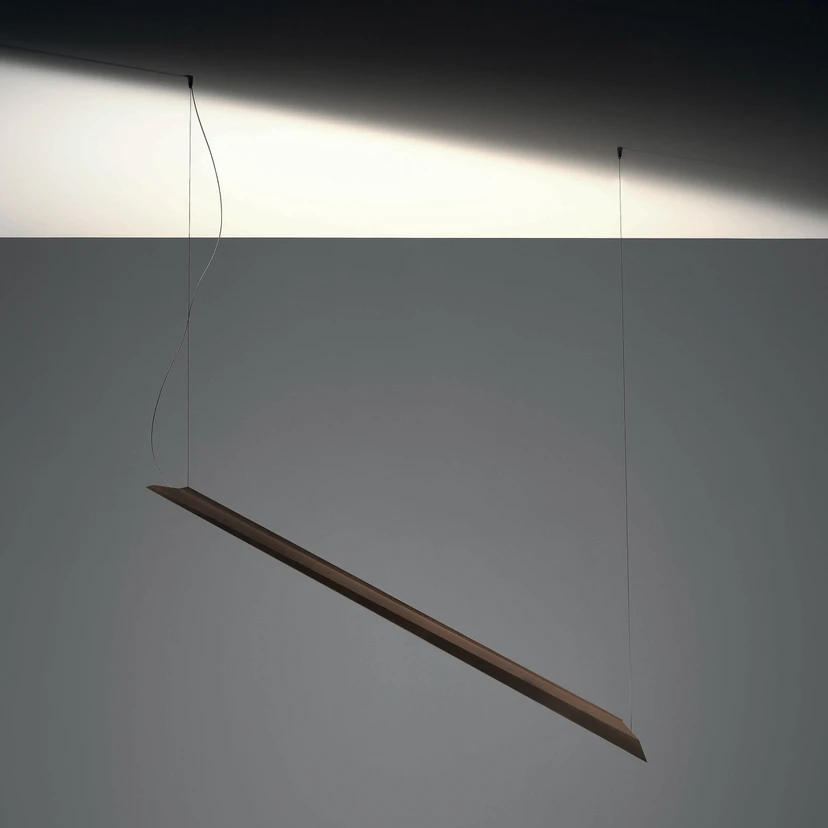 Závěsné LED světlo Schegge poskytuje skvělý světelný zážitek. Jeho štíhlý tvar vyrobený z vysoce kvalitního hliníku je ručně vyráběný v Itálii a je skutečně jedinečný. Jemné hrany obklopují LED diody, které svítí nahoru teplým bílým světlem a velkoryse a nepřímo osvětlují místnost. Jas zdroje jasného světla lze regulovat a optimálně upravit pomocí stmívače fázového řezu. Svítidlo je zavěšeno na čtyřech ocelových lanech, které umožňují různé zavěšení. Pokud se vám to líbí trochu individuálnější, můžete to udělat bez vodorovného zarovnání a umístit jednu stranu výše než druhou. To také vytváří zajímavý nasměrovaný paprsek světla a světelný prvek vypadá jako umělecké dílo. Bez ohledu na to, jak je závěsné svítidlo instalováno, bude centrálním poutačem v místnosti a přesvědčí svým moderním, nadčasovým a elegantním designem. Použitím několika světel tohoto typu vznikají světelné obrazy, které se ve velkých místnostech a vstupních prostorách cítí pohodlně.