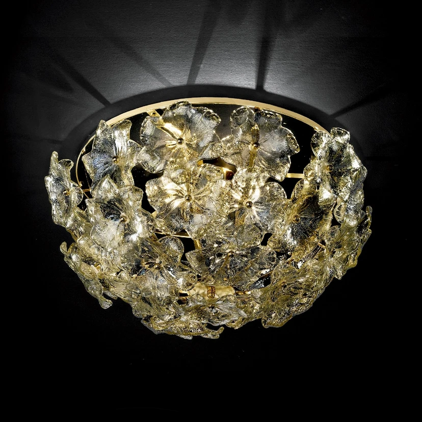 Zlatá třpytivá florentská stropní lampa Lotvs, pozlacená 24karátovým zlatemJednotlivé prvky z muránského skla, které tvoří stínidlo této stropní lampy ve florentském stylu, vypadají jako právě rozkvetlé křehké květy. V podstatě průhledné květy jsou zbarveny do zlata, což při rozsvícení lampy vytváří jemný a hřejivý třpyt, díky němuž je atmosféra útulná a příjemná. Světelný zdroj v klasickém stylu, jehož 24karátově pozlacený kovový povrch působí mimořádně elegantně.