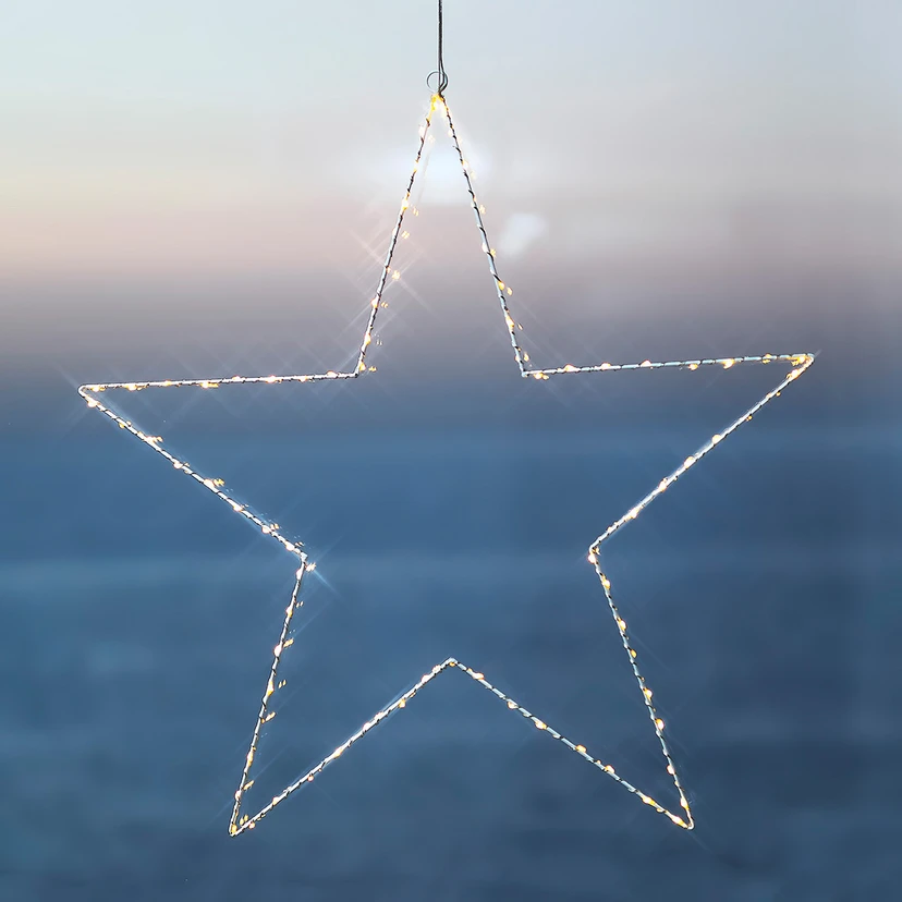 S hrdým průměrem 70 cm představuje tato krásná hvězdná silueta okenní dekoraci, která potěší obyvatele jasným světlem v temných týdnech před Vánocemi a pozdravuje kolemjdoucí z dálky. Je krásně osvětlen 80 LED. Součástí dodávky je transformátor.