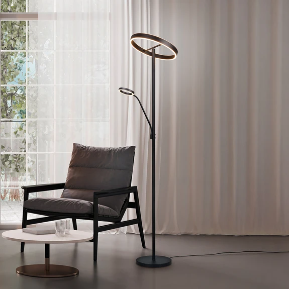 Moderní stojací lampa Willis LED se světlem na čtení, senzorovým stmívačem a funkcí CCT Stojací lampa Willis LED z kovu je moderní a všestranný zdroj světla. Hlavní světelný zdroj je umístěn v prstencovité, do stran naklápěcí hlavě a poskytuje přímé i nepřímé osvětlení. Na rámu je umístěno také světlo na čtení, které lze díky ohebnému rameni libovolně nastavit. Oba světelné zdroje lze spínat samostatně. Jas lze regulovat pomocí senzorového stmívače a k dispozici je také funkce CCT pro třístupňovou regulaci teploty barev.