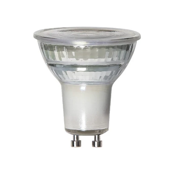 Čirý LED reflektor GU10, 6 W, teplá bílá, stmívatelný Tento 6W LED světelný zdroj s paticí GU10 má tvar reflektoru s čirým sklolaminátovým krytem. Reflektor LED vydává teplé bílé světlo a je externě stmívatelný.