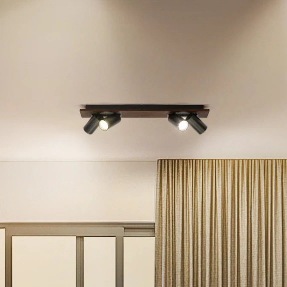 Stropní bodové svítidlo LED Mercury, čtyřplamenné se světelnými zdroji LED GU10 Stropní bodové svítidlo LED Mercury se čtyřmi plameny zaujme krásnou kombinací materiálů a barev a jednoduchým designem. Dlouhý obdélníkový vrchlík, který je stejně jako čtyři bodovky vyroben z lakované oceli, má o něco větší dekorativní panel z tmavého dřeva. Na něm sedí reflektory jako dvojice v ocelových oválech. Nastavitelnost každého jednotlivého reflektoru umožňuje cílené osvětlení různých částí místnosti. Součástí dodávky jsou stmívatelné LED světelné zdroje GU10, které lze vyměnit - Kompletní montážní a připojovací příslušenství je součástí dodávky