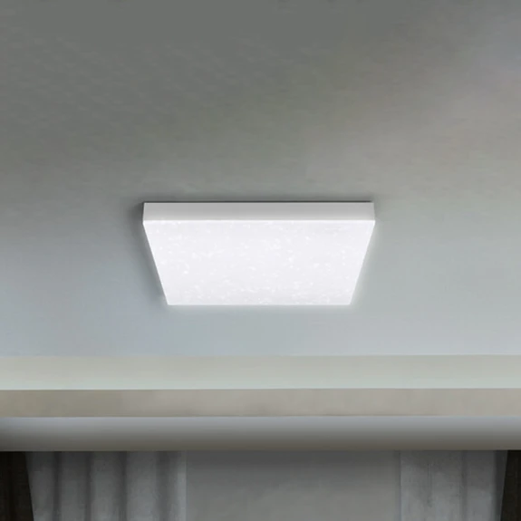 LED panel Planon FL Sparkle s funkcí CCT a technologií SMART WiFiPloché, hranaté stropní svítidlo Planon FL Sparkle LED lze chytře ovládat díky technologii WiFi, konkrétně po připojení k síti WLAN prostřednictvím tabletu nebo chytrého telefonu s aplikací LEDVANCE SMART WiFi, která je zdarma k dispozici pro zařízení se systémy Android a iOS. Hlasové ovládání pomocí Google Assistant nebo Amazon Alexa je také možné. Panel má bezrámový design a plastový kryt, který díky třpytivému efektu vytváří v místnosti efekt třpytivé hvězdné oblohy. Jas a teplotu barev lze nastavit podle situace. LED panel se snadno a rychle instaluje, kompletní instalační materiál je součástí dodávky.- Stmívatelný- Nastavitelná barva světla: teplá bílá (3 000 K) až denní světlo (6 500 K)- Inteligentní integrace přes WLAN- Ovládání přes aplikaci LEDVANCE SMART WiFi- Možnost hlasového ovládání přes Google Assistant nebo Amazon Alexa