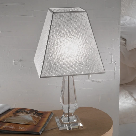 Notte - stolní lampa s texturovaným polyesterovým stínidlem a skleněným podstavcem Stolní lampa Notte vyzařuje příjemnou lehkost. Tento efekt vytváří stínidlo i podstavec, které jsou průhledné, respektive čiré, a lze je proto bez námahy začlenit do jakéhokoli barevného schématu. Za zdůraznění stojí také speciální struktura hranatého stínidla, která vytváří příjemné rozložení světla, aniž by se příliš ztratila svítivost žárovky nebo úsporné lampy. Vynikající zdroj světla pro klasicky zařízené obytné prostory, exkluzivní osvětlovací produkty tohoto výrobce jsou vyráběny výhradně ručně v Itálii, kde je věnována velká péče výběru materiálů vynikající kvality. Vychází to v neposlední řadě z touhy navázat na dlouhou tradici benátského osvětlovacího umění a vyrábět výrobky, které jsou vytvářeny s vášní a péčí a mají drobné zvláštnosti, které je činí jedinečnými a nezaměnitelnými.