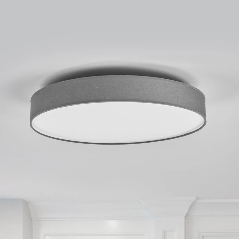 Šedé textilní stropní svítidlo Saira s dobrou svítivostí Toto textilní stropní svítidlo dobře osvětluje obytný prostor, protože teplé bílé LED diody instalované za stínidlem jsou mimořádně jasné, ale spotřeba energie zůstává na poměrně nízké úrovni. Šedý textilní povrch je stylovou volbou, pokud jde o barvu, protože šedá barva se již dávno zbavila své staré image a neznamená již nudu a fádnost, ale ukazuje se jako skutečný poutač pozornosti s třídou a stylem, zejména v obývacím prostoru v kombinaci s dalším barevně sladěným nábytkem.