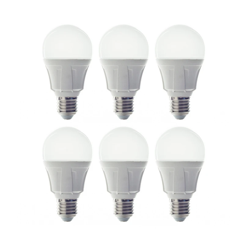 LED žárovka E27 11 W v sadě 6 kusů Tato žárovka díky technologii LED staví své předchůdkyně do stínu a s klasickou žárovkou má společný pouze tvar. Tato LED žárovka svítí s úsporou energie přibližně 85 %, zatímco její velmi dlouhá životnost 30 000 hodin zaručuje dlouhotrvající radost ze svícení a přináší do vašeho domova teplé bílé světlo. Díky patici E27 ji lze v mžiku nahradit běžnou žárovkou E27 - tato LED žárovka je náhradou až za 70 W. Technické údaje: - velmi dobré podání barev (Ra 82) - účiník > 0,6 - nestmívatelná - okamžitě se rozzáří - má minimální dobu náběhu kratší než 1 sekunda - zachování světelného toku žárovky ≥ 85 % při 75 % průměrné životnosti - dodává se v praktické sadě 6 žárovek