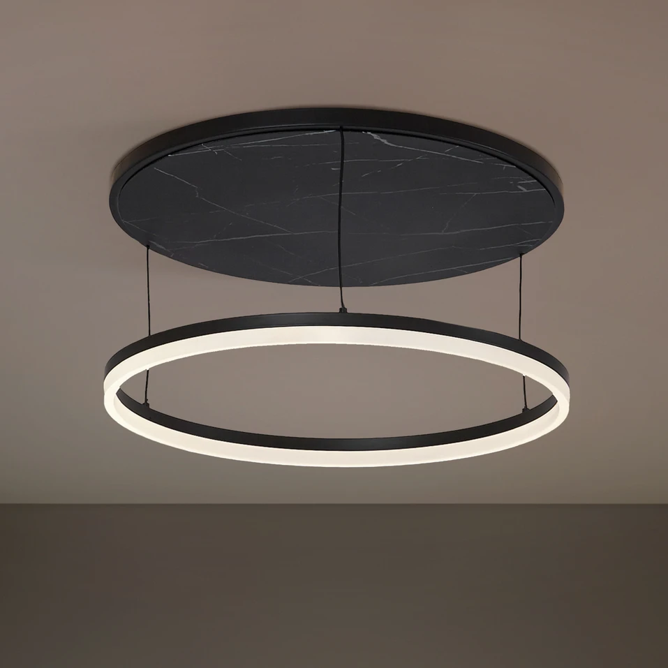 LED stropní svítidlo Orven spojuje nadčasový design s moderní funkčností. Je vyrobeno z kovu ve stylové kombinaci černé barvy a mramorového vzhledu a dokonale zapadá do moderních interiérů. Integrovaný LED světelný zdroj zajišťuje rovnoměrné osvětlení a příjemnou barvu světla teplá bílá (3 000 K), která vytváří útulnou atmosféru. S barevným podáním 80 Ra je dosaženo přirozeného a harmonického světelného efektu.