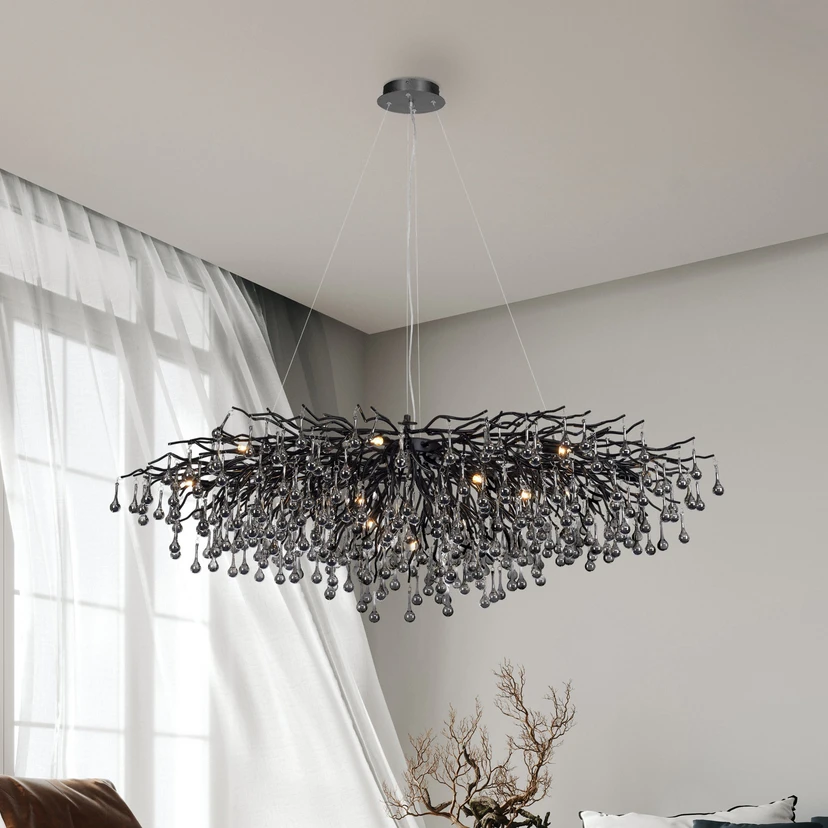 Lustr Icicle v černé barvě s přívěskem z duhového skla Nádherný lustr Icicle je dokonalou volbou, pokud jde o působivé osvětlení prostorných vstupních prostor, velkých místností nebo dokonce hal. Lustr vyzařuje eleganci a exkluzivitu a vyvolává rozruch. Mnoho jednotlivých černých vzpěr, které vypadají jako filigránské větve, je osazeno nesčetnými třpytivými skleněnými kapkami. Ve světle žárovek G9 vytvářejí skleněné kapky atmosférické světelné efekty. Lustr Icicle drží na místě čtyři jemná drátěná lanka, která jsou připojena ke kulatému vrchlíku. Při montáži lustru je nutné zohlednit jeho hmotnost.