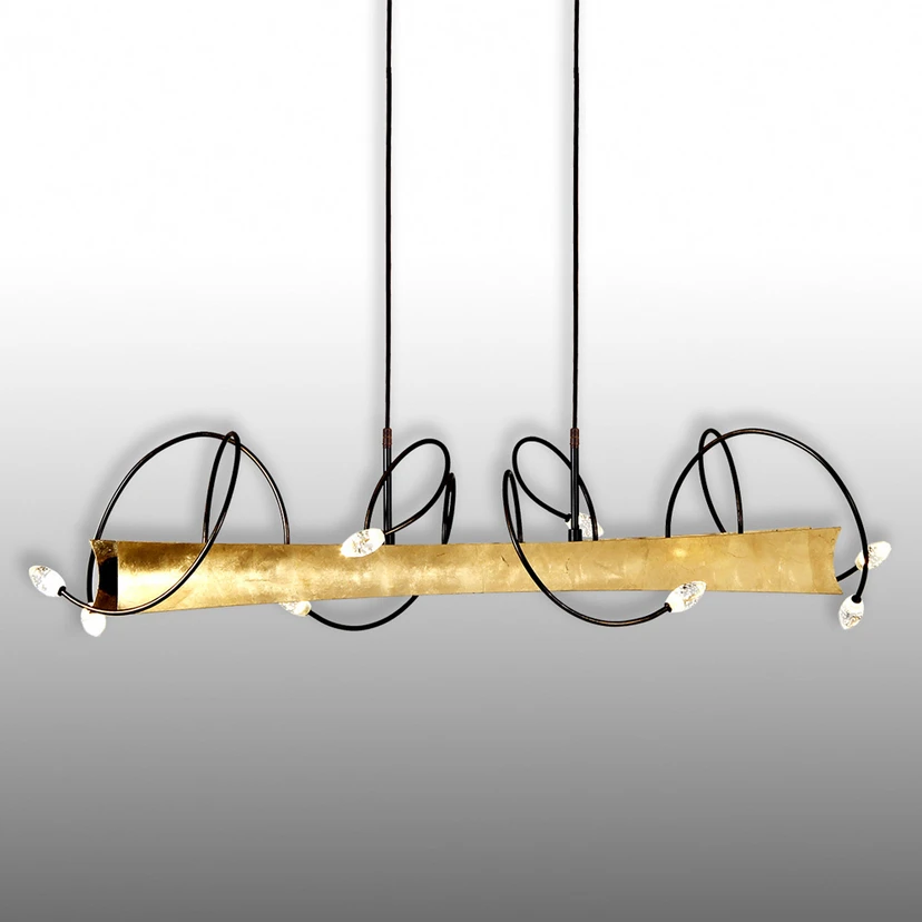 Tenká kovová ramena s LED připevněnými na koncích elegantně obepínají tělo závěsného světla LED Donna, které je pokryto zlatým listem. Hlavní světlo lampy je umístěno na spodní straně a lze jej zapnout nezávisle na přídavných LED. LED diody zabudované do malých kapiček lze také ztlumit. Přepínač hlavního světla i stmívač malých LED jsou umístěny přímo na světle, což umožňuje bezproblémový provoz. Donna nabízí mnoho možných použití a je ušlechtilá a také univerzální lampa.
