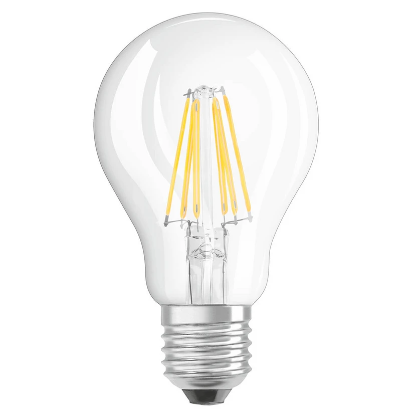 E27 7W LED žárovka GLOWdim Vlákno s čirým sklem Tento světelný zdroj je vybaven efektem GLOWdim, který při ztlumení mění barvu světla. Čím více se světlo stmívá, tím je teplejší - GLOWdim 2 700 K až 2 000 K
