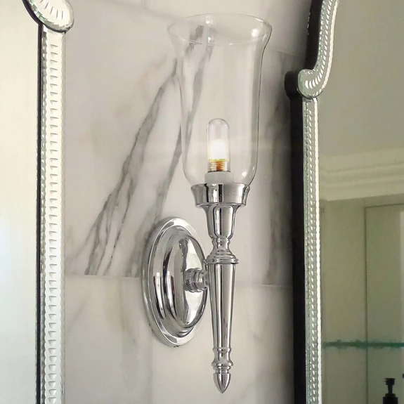 Jako nové vydání pochodní ve starých zdech, světlo zrcadla svítí v nové kráse. Je vybaven třídou ochrany IP44 a byl navržen pro instalaci v koupelně. Stříkající voda jí nemůže ublížit, takže nic nestojí v cestě rozsáhlému potěšení ze sprchování. Stříbrný kov v kombinaci s čirým sklem činí ze zrcadlového světla jedinečnou dekoraci a osvětlovací předmět, díky kterému je pobyt v koupelně atmosférickým potěšením.