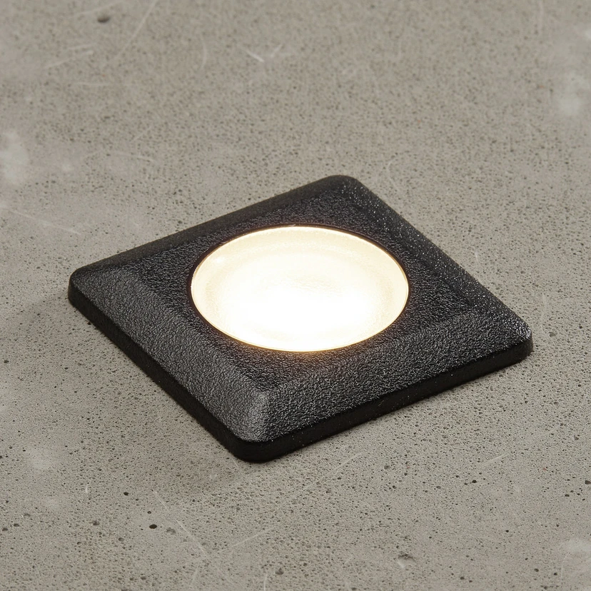Úhlové zapuštěné svítidlo Aldo vyzařuje teplé bílé světlo LED lampy přímo přes plochý kryt z čirého polykarbonátu. Může být instalován uvnitř i venku v podlaze nebo ve zdi a je ideální například pro osvětlení verandy.