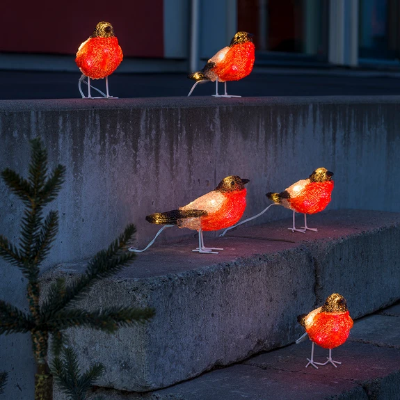 Sada pěti rorýsů - venkovní osvětlené figurky s LED diodami Toto hejno ptáčků vypadá rozkošně a dodá okouzlující vzhled každému venkovnímu prostoru, ať už jde o terasu, balkon, nástěnné projekce nebo podesty. Pět robinsonů je osvětleno bílými LED diodami pro denní světlo a zaručeně upoutají pozornost každého. Přívodní kabel je bílý. Součástí sady pěti kusů je venkovní transformátor.