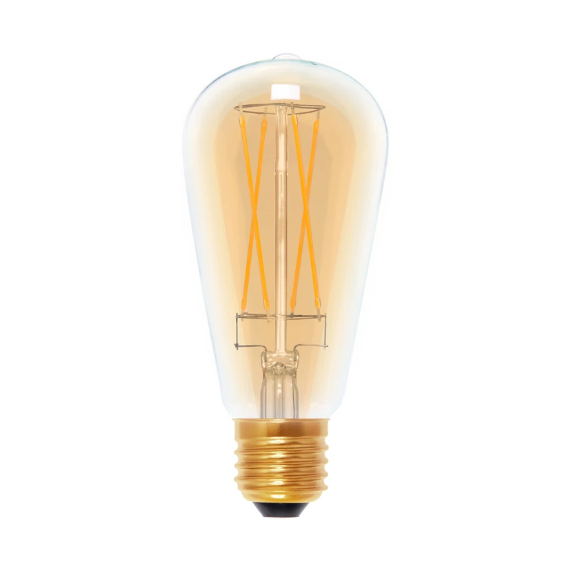 LED žárovka E27 ST64 5W Rustika 2 200K zlatá stmívatelná Tato LED žárovka v rustikálním provedení se zlatě zabarveným sklem, krásnými LED vlákny a extra teplou barvou světla 2 200 K je světelným zdrojem, který je ideální pro použití ve svítidlech bez stínidla. Jas lze také stmívat většinou standardních stmívačů - zlatá základna - mimořádně dobré podání barev s indexem Ra >90 - možnost stmívání většinou standardních stmívačů - mimořádně dobrá stabilita spínání (100 000 spínacích cyklů)