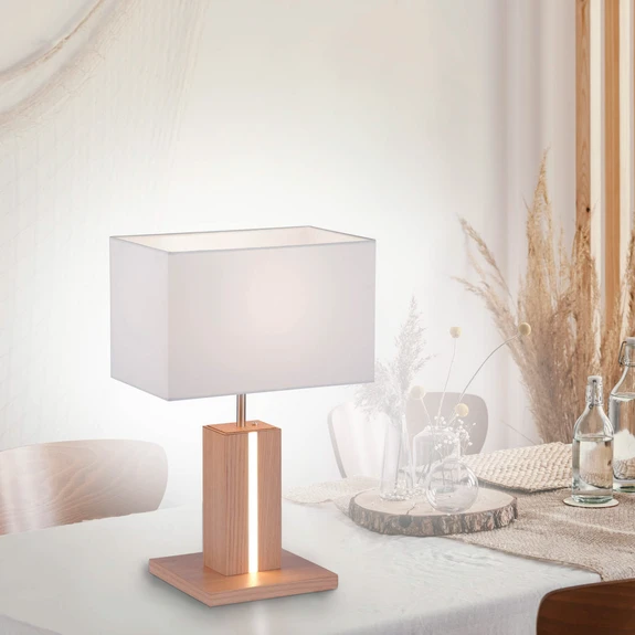 Tato stolní lampa přitahuje pozornost a je skutečnou ozdobou. Přirozeně vypadající podstavec je vyroben z plastu a zdoben dřevěným vzhledem. To dokonale ladí se stínidlem z textilu, které díky své struktuře vyzařuje rozptýlené světlo. Základna se zdá být uprostřed rozdělená, za přívodem ve tvaru pruhu se nacházejí teplé bílé LED diody, které jasně svítí směrem ven a vytvářejí atmosférický efekt. Lze je stmívat pomocí samostatného, diskrétního spínače na základně svítidla a lze také nastavit barvu světla. Za stínidlem je navíc vložena žárovka E27, kterou lze díky flexibilním možnostem výběru dokonale přizpůsobit instalovaným LED diodám a jejich světelnému efektu. Světelné zdroje lze zapínat a vypínat odděleně pomocí kolébkového spínače na držáku zásuvky, který umožňuje individuálně zvolit, zda mají být zapnuty oba světelné zdroje, nebo pouze jeden.