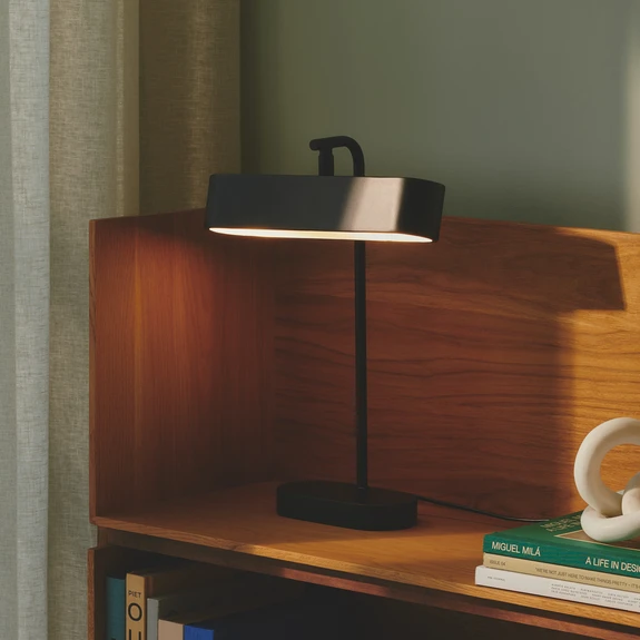 Kovová stolní lampa Merlin, černá Merlin je moderní interpretací klasické knihovní lampy. Je vyrobena z černého kovu s dlouhým stínidlem oválného tvaru, které lze pomocí kulového kloubu nastavit do požadované polohy. Do dlouhého stínidla jsou vloženy dvě LED žárovky G9 (nejsou součástí dodávky), jejichž světlo přes satinovaný kryt svítí rovnoměrně a bez oslnění.