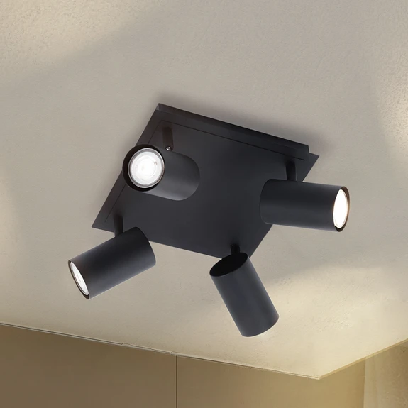 Čtyřsvětelný stropní bodové světlo Joffrey Stropní bodové světlo Joffrey je vybaveno čtyřmi válcovými stínidly na lampu, která poskytují cílené světlo. Stínidla na lampu lze snadno individuálně nastavit pomocí kloubů. Design svítidla je nadčasový a minimalistický, takže se Joffrey přizpůsobí jakémukoli stylu zařízení.