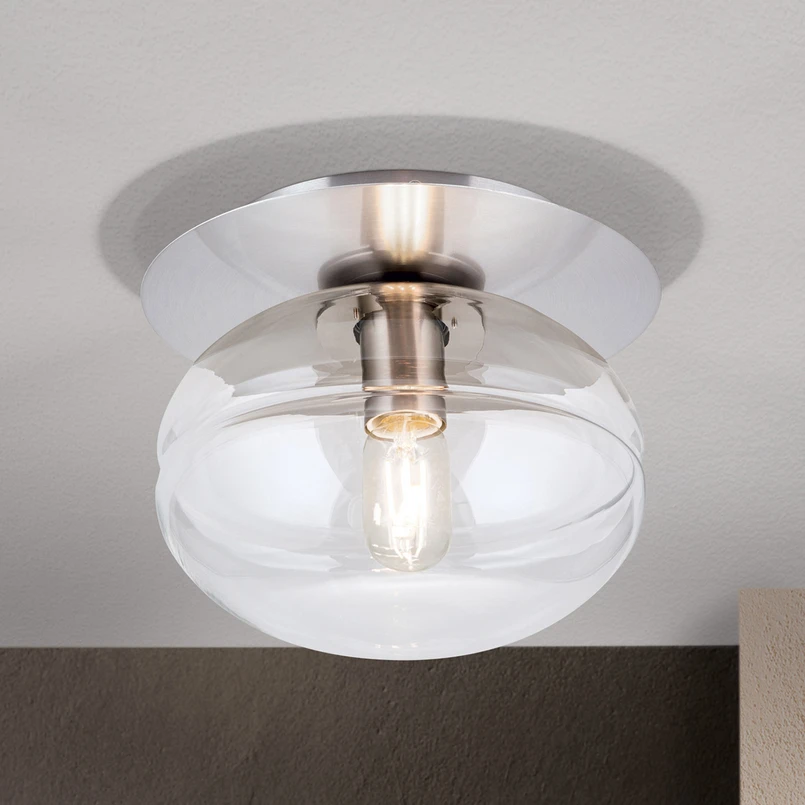 Stropní svítidlo Richard s ručně foukaným skleněným stínidlem Stropní svítidlo Richard, které se skládá z kovového vrchlíku a ručně foukaného skleněného stínidla připevněného šroubovým závitem, působí elegantně a okouzlujícím dojmem. Uprostřed tohoto stínidla, které má baňatý tvar a je vodorovně rozděleno integrovanou drážkou, se nachází patice E27, do níž lze osadit LED žárovku do 8 W. Stínidlo má tvar baňky a je vodorovně rozděleno integrovanou drážkou. Vzhledem k tomu, že světelný zdroj je viditelný přes průhledné skleněné stínidlo, doporučujeme použít průhlednou žárovku LED. Stropní svítidlo Richard osvětluje chodby a obytné prostory světlem, které vyzařuje do všech směrů, a to buď jako samostatné svítidlo, nebo při instalaci ve skupině. Jas lze také regulovat výběrem stmívatelného světelného zdroje.