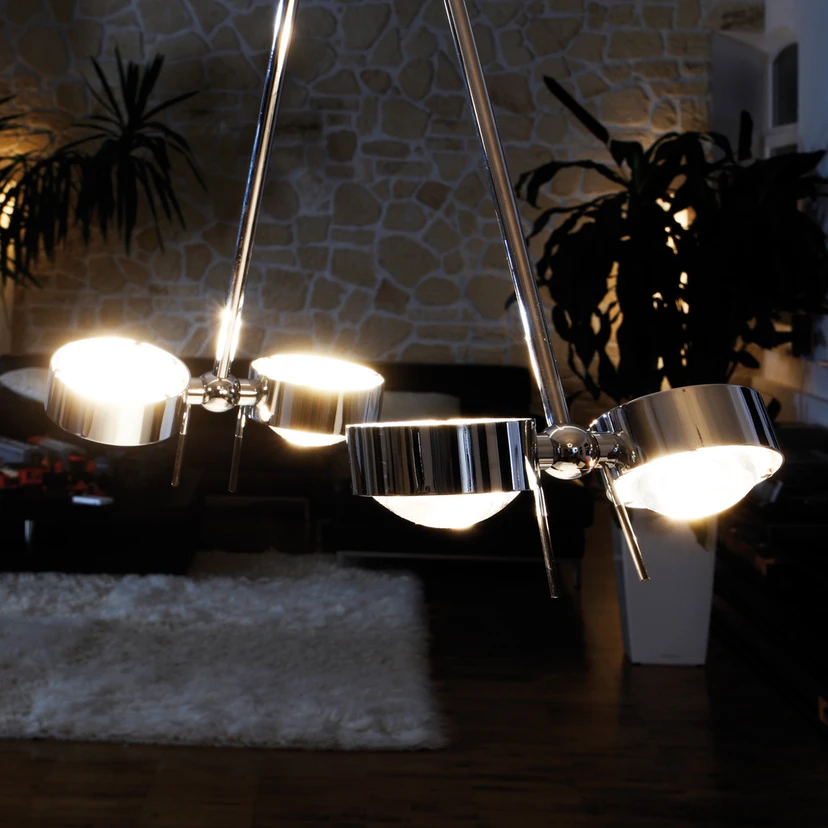 Osvětlení v ultramoderním designu: stropní svítidlo PUK CEILING Zvláštností stropního svítidla PUK CEILING je, že je na jedné straně každého stínidla vybaveno skleněnou čočkou, která světlo soustřeďuje a účinně vyzařuje do místnosti. Na druhé straně se nachází disk z bílého matného skla. Jednotlivá stínidla lze podle potřeby seřídit. Vrcholem je však to, že čtyřplamenné světlo se skládá ze dvou ramen, která lze umístit podle potřeby - přímo vedle sebe nebo velmi daleko od sebe, pokud je například pozváno mnoho hostů a světlo má osvětlit celý jídelní stůl. Jako volitelné příslušenství jsou k dispozici také barevné filtry, které se vkládají mezi kryt lampy a čočku a vytvářejí krásné barevné efekty v červené, purpurové, žluté, modré nebo zelené barvě. Exkluzivní světla tohoto výrobce se vyrábějí v Německu a vyznačují se vysokými standardy kvality a inovativním designem.