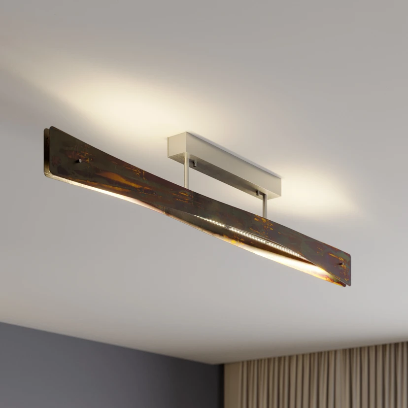 Podlouhlé stmívatelné stropní svítidlo LED Lian s oxidovaným povrchem zlaté barvy, vyrobené v Německu Lian má jasné, účinné a příjemně teplé bílé LED diody, které lze v případě potřeby stmívat, pokud je nainstalován fázový stmívač na přední nebo zadní hraně. Povrch dvou zakřivených kovových stínidel byl ručně mistrně zoxidován, čímž vznikl vzrušující, individuální rezavý vzhled, který potěší nejen příznivce vintage, ale bude skvěle vypadat i v jiných moderních stylech interiéru. Světlo vyzařuje nejen směrem dolů, ale i nahoru, čímž vytváří útulné všesměrové osvětlení. Díky vysoké hodnotě CRI (>90) jsou barvy v obývacím pokoji reprodukovány maximálně autenticky. Připojovací prostor ve stropní krabici se ukazuje jako velmi velký, takže je zde dostatek místa pro uložení všech komponentů během instalace. Je třeba také zmínit, že stropní svítidlo Lian LED bylo vyrobeno v Německu v nejvyšší kvalitě, a proto se jedná o skutečně kvalitní osvětlovací výrobek.