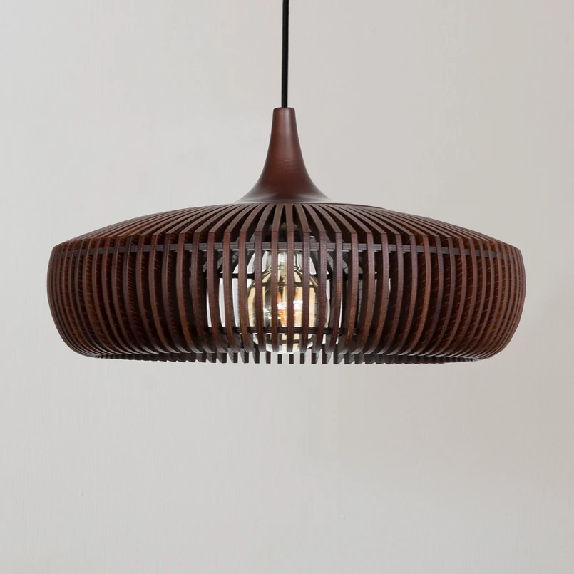 Závěsná lampa Clava Dine Wood z tmavého dřeva s lamelovým vzhledem