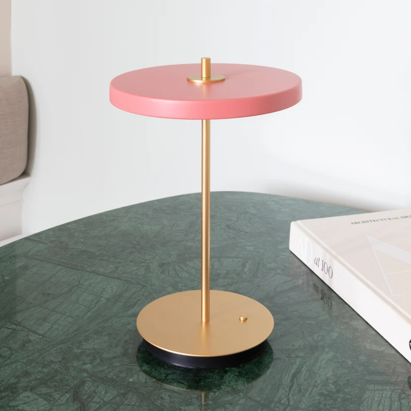 UMAGE LED stolní lampa Asteria Move, růžová/mosaz, 31 cm