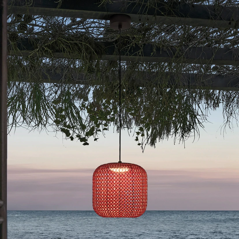 Designová venkovní závěsná lampa Nans A s tkaným stínidlemDesignová společnost Bover se sídlem v Barceloně ztělesňuje svými výrobky Made in Spain středomořský životní styl. Závěsná lampa Nans je určena pro venkovní použití, ale lze ji použít i v interiéru. Válcovité stínidlo je utkáno ze syntetického vlákna, v němž se proplétají různobarevné nitě. Závěsná lampa je triakově stmívatelná, stmívač není součástí dodávky.