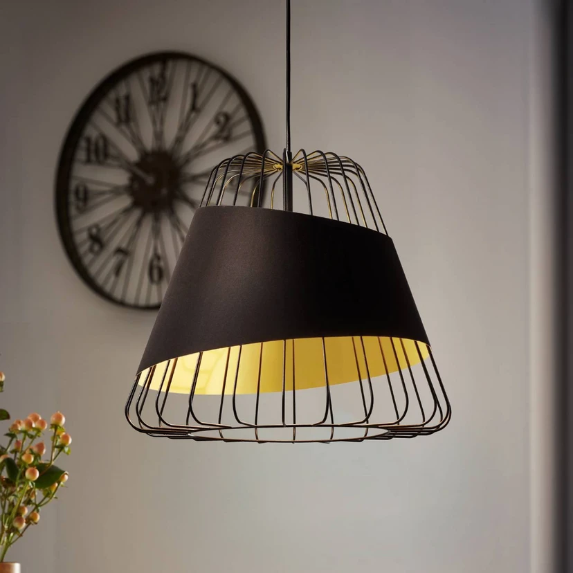 Závěsná lampa Austell, Ø 43 cm, černá/zlatá, kov, látka