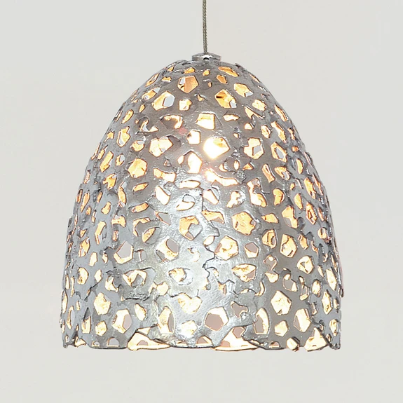 Z kulatého stropního držáku vychází úzký připojovací kabel a končí ve stříbrném železném odstínu. Stínidlo je zdobeno nepravidelnou strukturou otvorů. Světlo je tak vyzařováno částečně přímo, částečně nepřímo do místnosti a na okolní stěny jsou vrhány nápadné stíny.