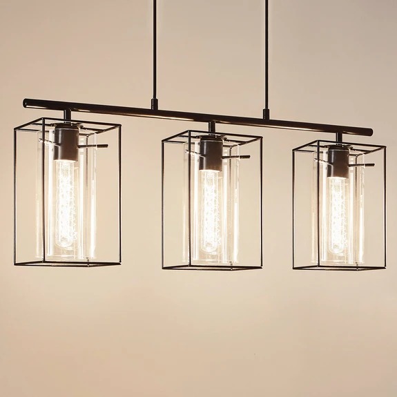 Závěsné světlo Loncino díky svému nápadnému designu upoutá pozornost nad každým stolem. Na úzkém kovovém podpěře, která směřuje z baldachýnu, byla namontována tři stínidla v dvojitém provedení. Venkovní stínidla jsou zhotovena z černých kovových výztuh, které tvoří kostku kolem vnitřních stínidel, a tato obzvlášť vynikají. Válcovitá vnitřní stínidla vyrobená z průhledného černého kouřového skla obklopují objímky a světelné zdroje. Aby byl vizuální vzhled dokonalý, doporučujeme použití filamentových žárovek v tzv. tvaru tubusu, jak je znázorněno. Vhodné žárovky jsou uloženy a lze je přímo současně objednat.