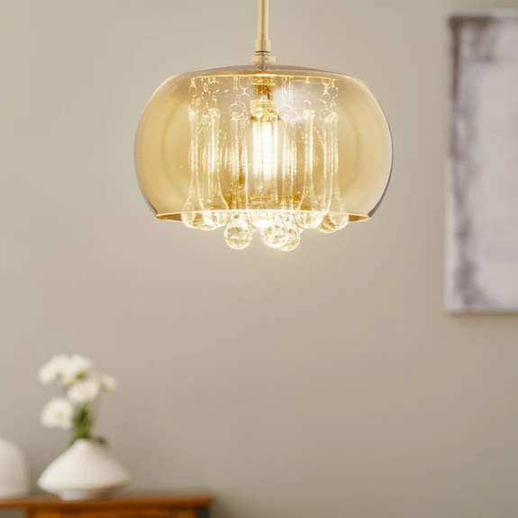 Závěsné svítidlo Argos LED s třpytivými křišťálovými šperky ve stínidle Stínidlo závěsného svítidla Argos LED je velmi zvláštní: skleněný povrch byl zušlechtěn ještě průhlednou chromovou úpravou, takže po zapnutí světla se co nejlépe ukáže vnitřek stínidla - půvabně navržené křišťálové přívěsky. Světlo vyzařované LED žárovkami s paticí G9 vytváří fascinující odlesky a vytváří velmi atmosférickou světelnou náladu.