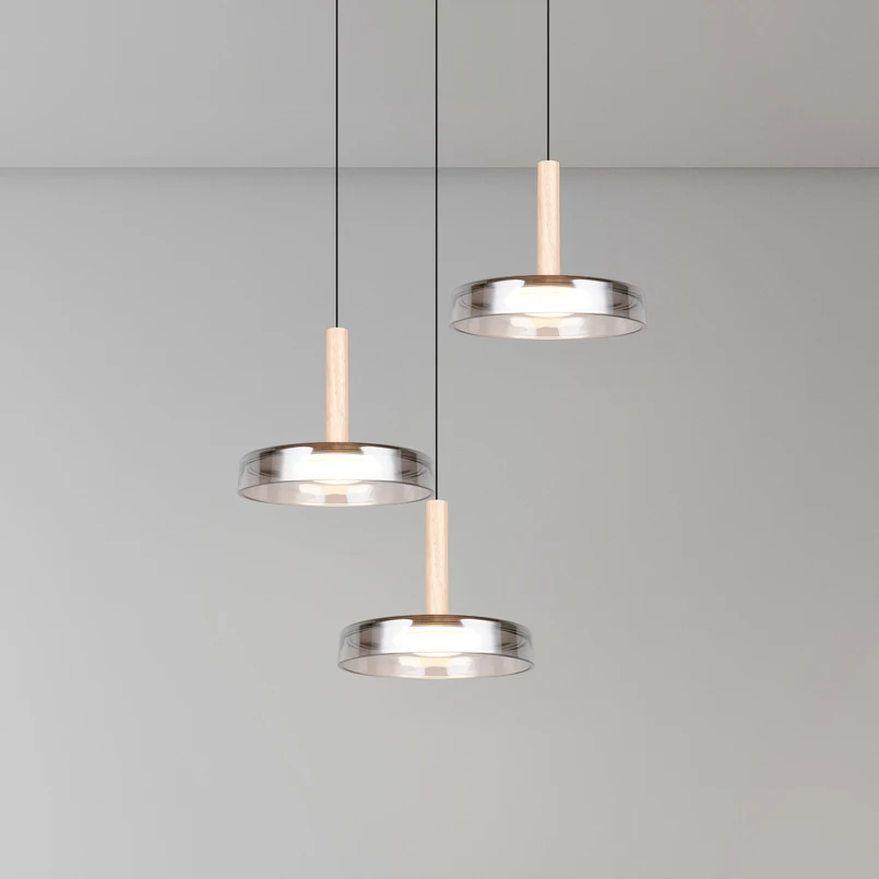 Závěsné svítidlo LED Celeste, chrom/dřevo, Ø 35 cm 3 světla, sklo tlumené