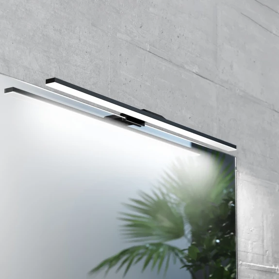 Moderní zrcadlové LED svítidlo Triga v černé barvě do koupelnyNa nástěnná zrcadla v koupelně je svítidlo Triga ideálním zdrojem světla. Štíhlý obdélníkový design a jednobarevné provedení dokonale ladí s moderním prostředím. LED diody svítí směrem dolů za satinovaným krytem, který rozptyluje světlo, a přesvědčují o nízkém oslnění. Svítidlo se montuje přímo na horní okraj zrcadla - Stupeň krytí: IP44 - LED ovladač je součástí dodávky - Snížené oslnění (UGR < 19)